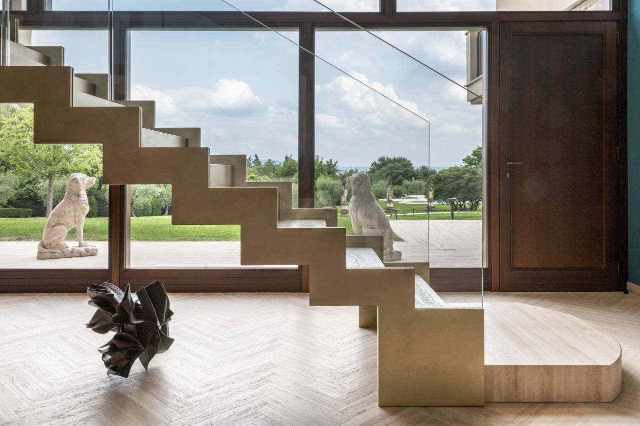 Lo studio di architettura ha curato lo studio, la progettazione e la realizzazione di una scenografica scala interna per una villa privata, combinando eleganza formale e precisione tecnica. Interamente realizzata in pietra travertino, la scala si distingue per la pulizia delle linee e la continuità materica, valorizzata dall’inserimento di paratie laterali in cristallo trasparente che ne esaltano la leggerezza visiva e il dialogo con lo spazio circostante. Il progetto rappresenta un perfetto equilibrio tra solidità strutturale e raffinatezza contemporanea.